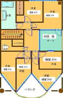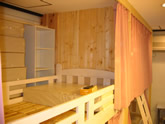 ドミトリー、シェアルームでも、ちょっとリッチに・・・。ベッド脇に専用クローゼット40着はブラウスが掛けられそう。また、収納ボックス2個付き。カラーボックス一人にひとつ。通常のベッドスペース1.5倍(ベッドスペース+個人利用スペースがついています。)また、読書灯が、各ベッドにあり、個人個人でカーテンを閉めても読書やパソコン、そして携帯の充電も出来る高機能ドミです。 |
